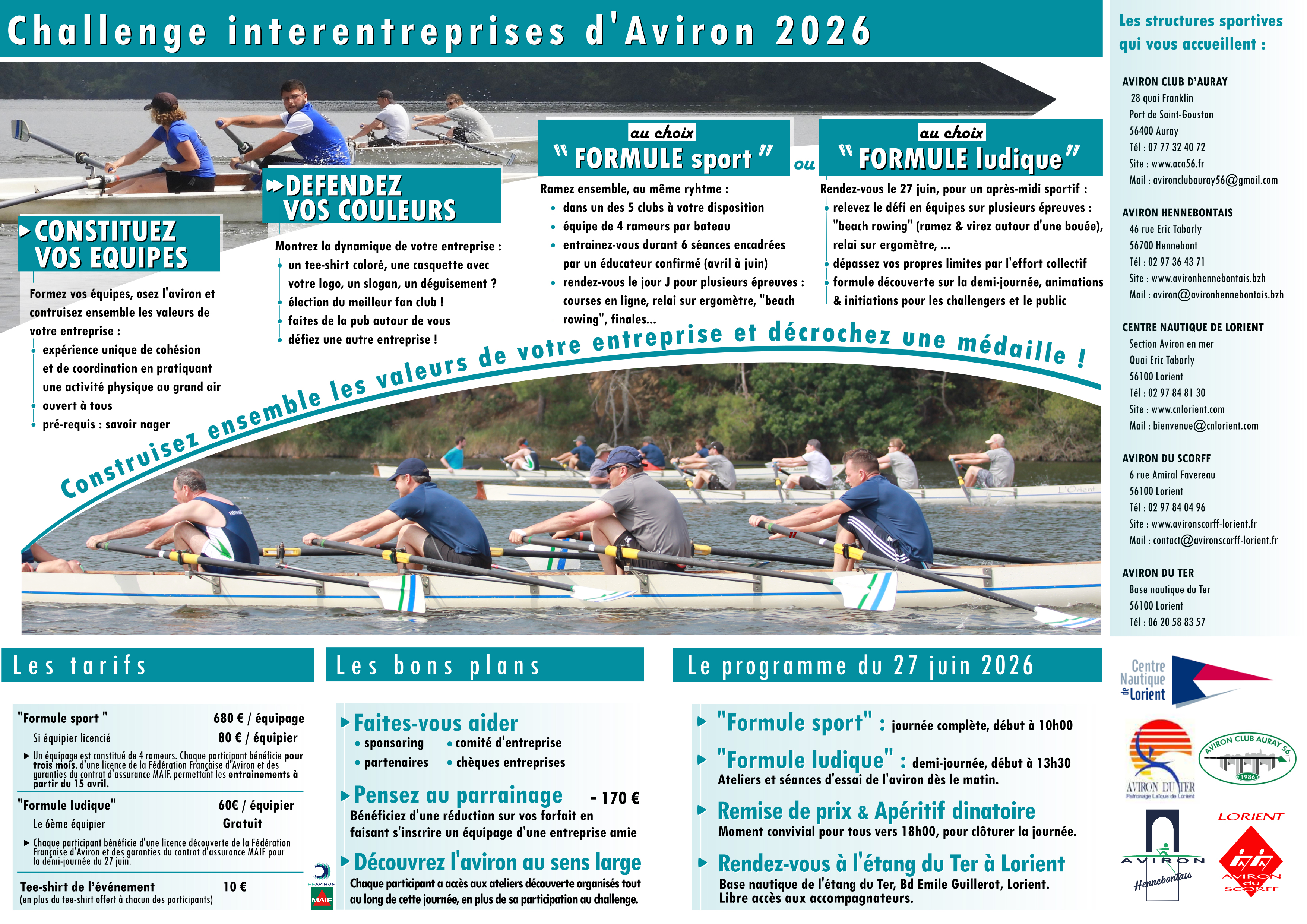 Le challenge interentreprises aura lieu le 27 juin 2026, sur la base nautique de l'Etang du Ter à Lorient. Deux formules sont proposées :