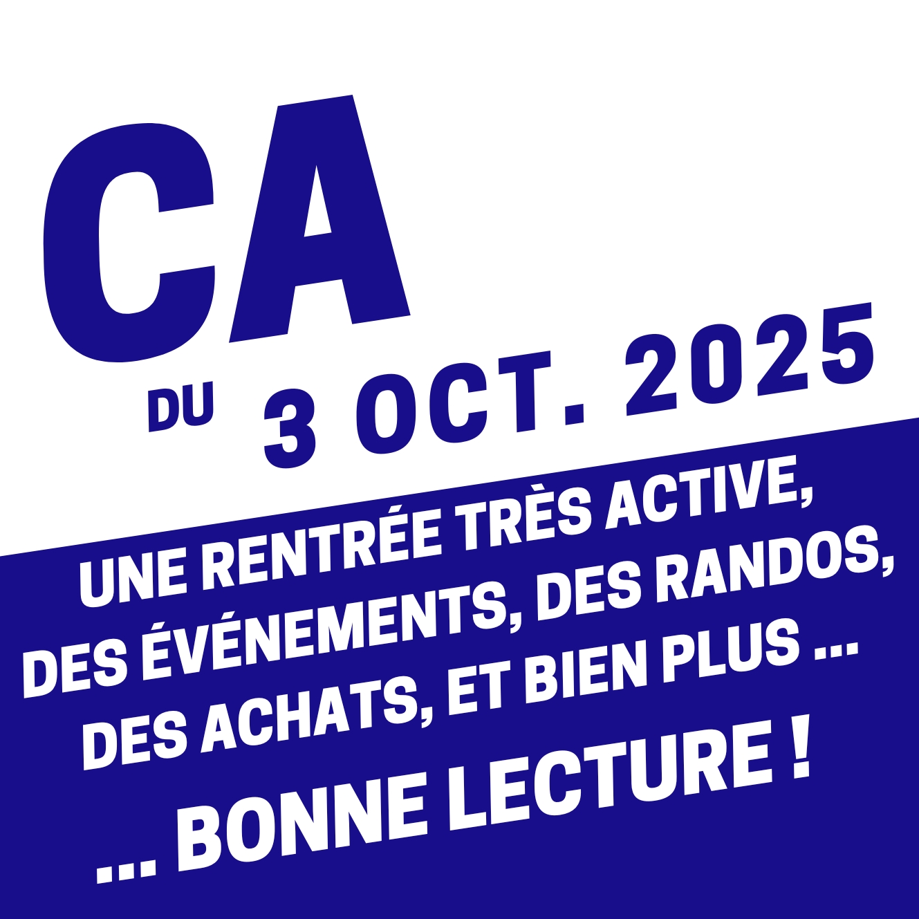 Une rentrée très active, un salarié en apprentissage que l'on connait maintenant bien, des évènements sportifs à noter dans vos agendas, des propositions de rando alléchantes, des achats de matériel à venir, une action Octobre Rose qui se prolonge jusqu'au samedi 18 et pour laquelle vous pouvez tous aller faire quelques kilomètres sur les 2 ergomètres de la galerie marchande d'Intermarché, et bien sûr des appels à bénévoles et des dates à retenir :